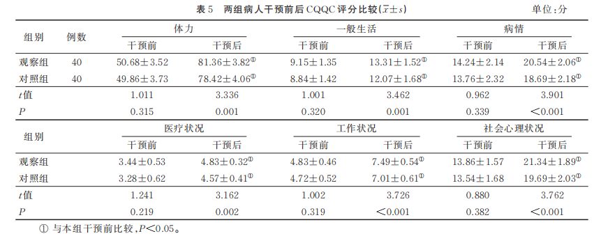 本研究发现,干预后观察组病人CQQC评分较对照组高(P<0.05),说明将IARA干预用于PCI术后病人的护理中可提高其生活质量。考虑是IARA干预中定期的会议为医疗团队及病人提供沟通机会,有助于病人更好地理解康复计划,包括术后的运动要求、可能遇到的挑战以及康复进展。这种信息的共享和交流有助于减轻病人的焦虑和不确定感,从而提高其对康复过程的掌控感,有助于更积极地参与康复;同时通过每次会议均强调心脏康复运动的重要性,使病人遵守医嘱及康复指导,使之获得更好的术后康复效果,增强其运动信心,减轻运动恐惧,减少并发症发生,从而改善生活质量。