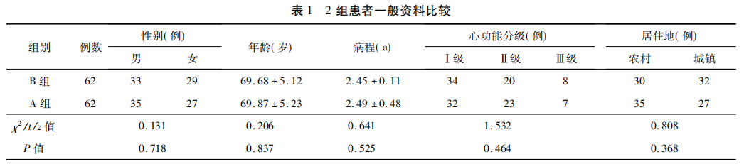 选取2021-12—2023-12我院收治的124例老年冠心病PCI术后患者作为研究对象。纳入标准:(1)术前明确诊断且符合PCI指征。(2)由同一组医生顺利完成手术且患者术后生命体征平稳,肢体功能无障碍。(3)心功能分级为Ⅰ~Ⅲ级。排除标准:(1)合并其他重要脏器严重功能不全或血液系统疾病者。(2)存在恶性肿瘤者。(3)认知及交流功能障碍者。(4)临床资料不完整者。患者家属对本研究知情并签署知情同意。根据随机数字表法分为2组,各62例。分别予以围术期常规心脏康复管理(A组)和基于5A模式的早期心脏康复管理(B组)。2组患者一般资料比较差异无统计学意义(P>0.05),具有可比性,见表1。