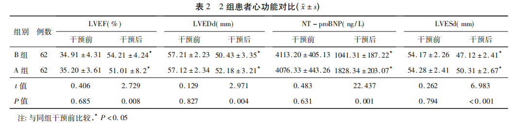 干预后2组LVEF、LVEDd、LVESd、NT-proBNP水平较干预前显著改善或减轻,且B组各项指标改善程度优于A组,差异均有统计学意义(P<0.05),见表2。