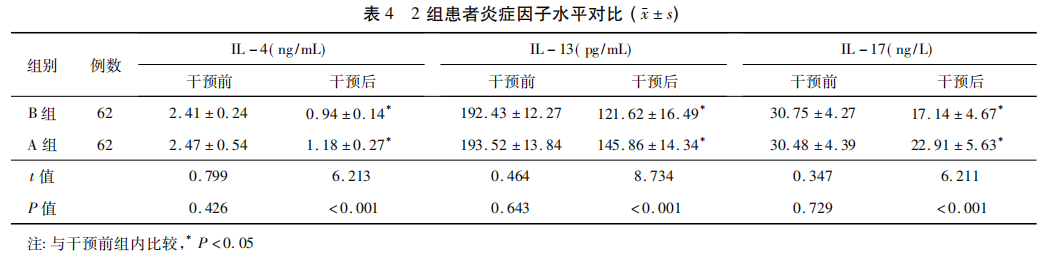干预后2组IL-4、IL-13、IL-17水平较干预前显著降低,且B组各项指标降低程度优于A组,差异均有统计学意义(P<0.05),见表4。