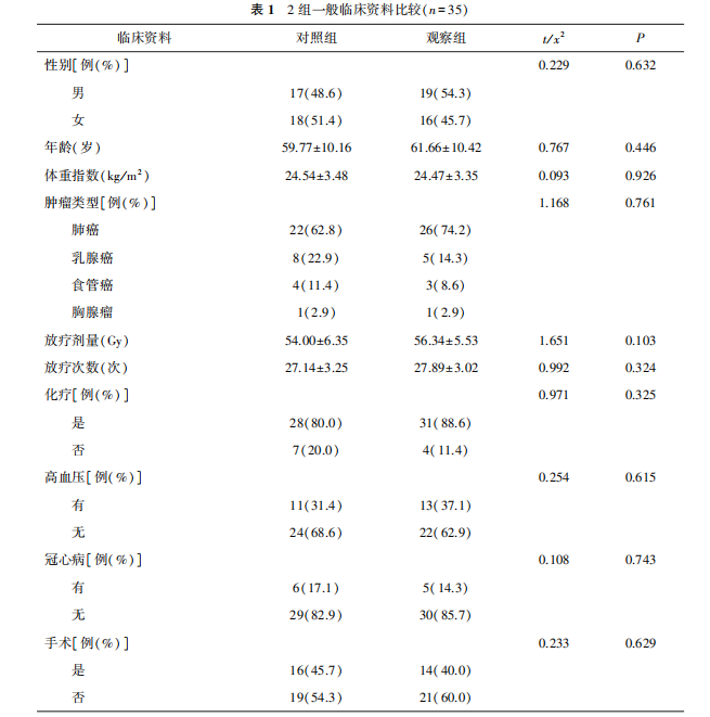 选取2024年1月—7月徐州市中心医院放疗科收治的胸部肿瘤患者70例,采用随机数字表法分为对照组和观察组,每组各35例。纳入标准:①经组织病理学明确诊断为胸部恶性肿瘤;②年龄≤75岁;③胸部放疗指征明确,且首次接受放疗;④预计生存期超过6个月;⑤卡氏评分≥70分;⑥自愿加入本研究并签署知情同意书。排除标准:①短期内有急性心肌梗死、高危不稳定型心绞痛、导致血流动力学不稳定的心律失常或其他急性心脏事件;②急性肺动脉血栓形成或肺栓塞;③合并严重心、脑、肾等重要器官功能不全者;④伴运动受限性疾病;⑤认知功能障碍或精神异常无法配合检查或运动干预。本研究已通过徐州市中心医院伦理委员会批准(XZXY⁃LK⁃20240111⁃0016)。2组患者一般表1。