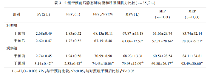 干预后,观察组FVC、FEV1、FEV1/FVC%、MVV、MIP和MEP高于干预前,且优于对照组(P<0.05)。干预后,对照组MVV、MIP和MEP低于干预前(P<0.05),其余指标变化差异无统计学意义(p>0.05)。见表3。