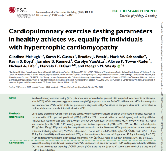 2025年5月5日,《欧洲预防心脏病学杂志》(Eur J Prev Cardiol)发表了一项来自麻省总医院与布莱根妇女医院团队的研究,探讨了如何通过心肺运动试验(CPET)更好地区分健康运动员与患有肥厚型心肌病(HCM)的高水平运动者。这项研究对于心脏科医师、运动医学专家以及临床运动评估从业者都具有重要启示意义。