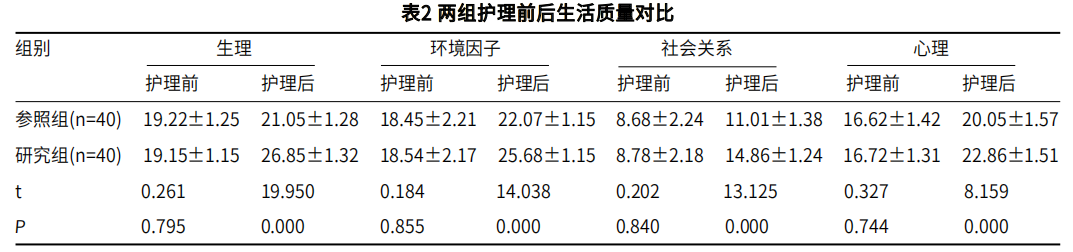 护理后研究组生活质量高于参照组(P<0.05)。详见表2。