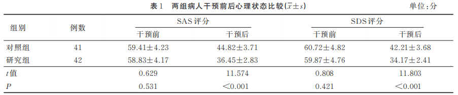 干预前后采用焦虑自评量表(SAS)、抑郁自评量表(SDS)评估两组病人心理状态。SAS总分80分,<50分为正常,50~59分为轻度焦虑,60~69分为中度焦虑,>69分为重度焦虑;SDS总分为80分,<53分为正常,53~62分为轻度抑郁,63~72分为中度抑郁,>72分为重度抑郁。