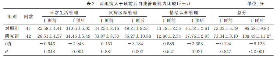 干预前后采用冠心病自我管理行为量表(CSMS)评估两组病人自我管理能力,该量表包括日常生活管理(40分)、疾病医学管理(75分)、情绪认知管理3个维度(20分),总分135分,分值越高表示病人自我管理能力越好。
