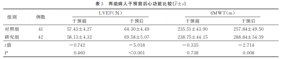干预前后采用左心室射血分数(LVEF)及6min步行试验(6MWT)评估两组病人心功能,LVEF以ApsarasUS⁃10型彩色多普勒超声诊断仪(康达洲际医疗器械有限公司)检测;6MWT距离越远表示病人心功能越好。
