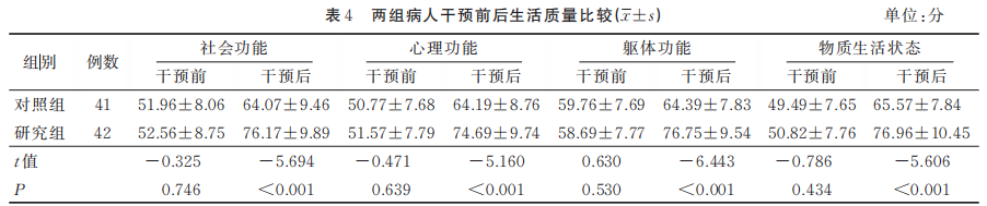 干预前后采用生活质量综合评定问卷(GQOLI⁃74)评估两组病人生活质量,该量表包括社会功能、心理功能、躯体功能、物质生活状态4个维度,各维度分值均为100分,分值越高表示病人生活质量越高。