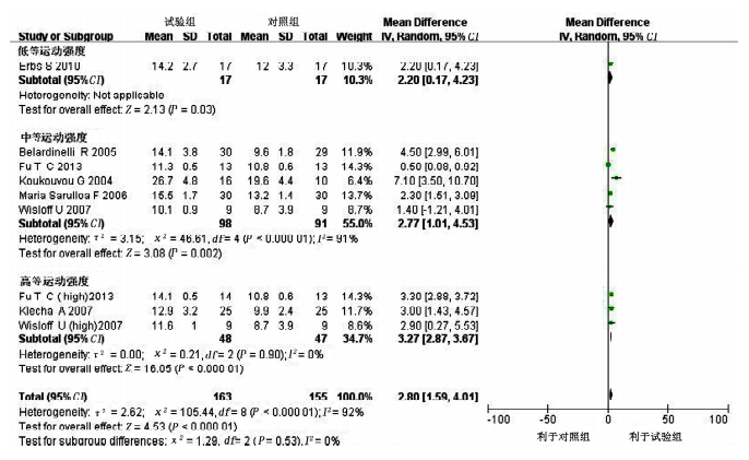 2.3.3.3 对AT的运动强度亚组Meta分析:低等运动强度组仅1项程研究,未做Meta分析;中等运动强度组共5项研究,各研究间存在异质性(L2= 91% ,P <0.05),采用随机效应模型进行Meta分析, 结果两组差异有统计学意义[MD = 2.77,95% Cl (1.01,4. 53), P =0.02];高等运动强度组共3项研究,各研究间无异质性(L2= 0, P =0.90), 釆用固定效应模型进行Meta分析,结果两组差异有统计学意义[MD = 3.27,95% Cl( 2.87,3.67), P <0.000 01]。详见图 7。