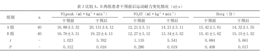 2.3 比较A、B两组患者干预前后运动耐力变化情况