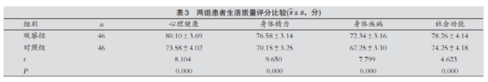 观察组生活质量各项评分均高于对照组,差异有统计学意义(P<0.05)。见表3。由此表明,综合心脏康复护理可充分促进患者的全身血液循环,改善因缺氧导致的心脏负担,给予心肌更充足的血液和养分,提升患者机体耐力。