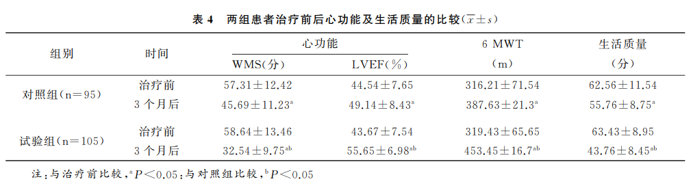 治疗3月后,试验组和对照组患者静息 WMS及生活质量评分均较治疗前明显下降,且试验组比对照组下降幅度更大(均P<0.05);试 验组和对照组LVEF及6MWT 评分均较出院时明显升高,且试验组较对照组升高幅度更大(均P<0.05),见表4。