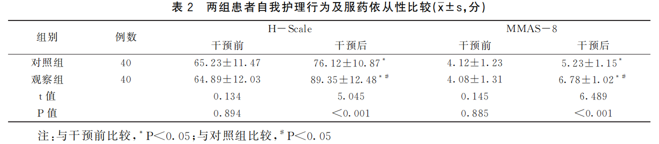 干预后,两组H-Scale和MMAS-8评分评分均提高(P<0.05),且观察组提高幅度大于对照组(P<0.05)。见表2。