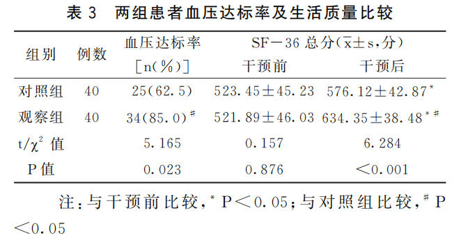 干预后,两组血压达标率与SF-36总分比较,观察组均比对照组高(P<0.05);干预前,两组sf-36总分差异无显著性(p>0.05)。见表3。