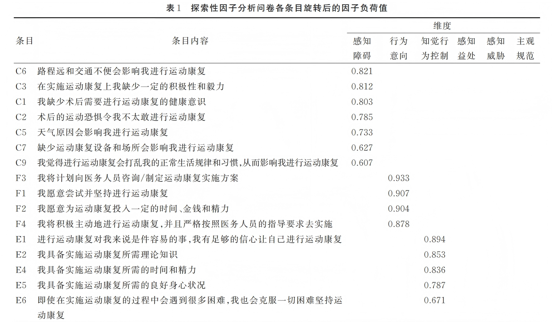 本研究结果KMO值为0.872,Bartlett球形检验值为3918.047,P<0.001适合做因子分析。因子分析采用主成分分析法,并进行最大方差旋转,固定提取6个公因子,累计方差贡献率为67.920%。条目b2存在双重载荷,予以删除。将剩余条目再次进行因子分析,固定提取6个公因子,累计方差贡献率为68.168%。问卷30个条目的因子载荷均>0.4,且无多重载荷,详见表1。